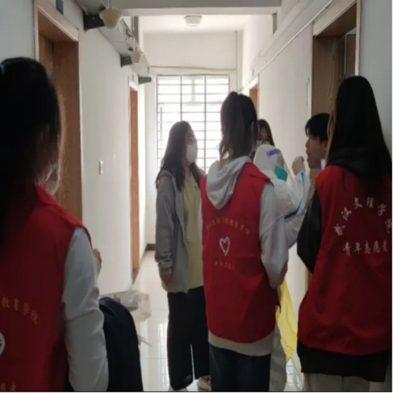 志愿者们提前与医护人员做好对接沟通工作,连续三天带领医护人员至各个静默管理点,逐栋逐层为静默宿舍的学生进行核酸采样,确保不遗漏一人。楼梯间忙碌的脚步声,敲门时轻声地呢喃,一群身穿红色马甲的志愿者奔走其间,默默无闻是他们服务的态度、一丝不苟是他们工作的初衷。在双方协调下,静默人员积极配合,志愿者的工作开展得井然有序,困难面前,原本寂静的楼道也有了温暖的气息。
