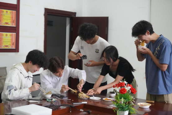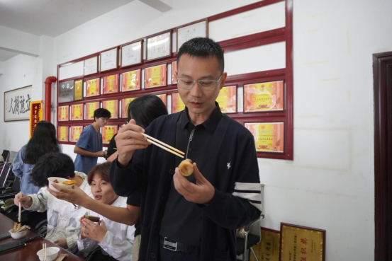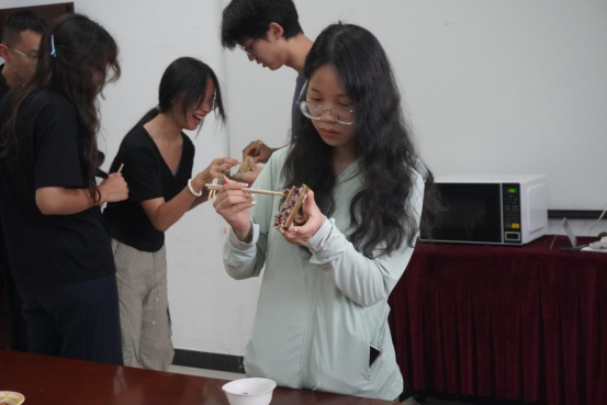 在各少数民族代表介绍完美食后,活动随机进入品鉴环节。在场师生纷纷起身,围拢在美食展台前,竞相品尝蒙古族奶豆腐、土家族酱香饼等特色佳肴。大家一边细细品味不同民族的独特风味,一边热烈交流着刚才听到的美食故事,不时发出“这奶豆腐奶香真浓郁”“酱香饼太入味了”的赞叹,更有人主动分享自己的品尝感受与文化感悟。现场笑语不断,热闹互动场景,让少数民族交流的氛围愈发浓厚。
