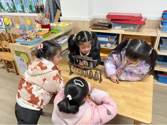 编钟课堂上,老师先以图文结合的方式引导孩子们认识编钟的构造、用途与历史地位,讲解其精妙设计并延伸青铜器相关知识,同步介绍编钟发源地与出土故事,搭配青铜尊盘、虎坐鸟架鼓等器物乐器拓宽认知,帮孩子们筑牢古代礼乐文明基础;随后通俗解读“一钟双音”的科学原理,借视听资料还原编钟在祭祀、宴饮中的使用场景,渗透礼乐文化内涵,师生还共同鉴赏《茉莉花》《金蛇狂舞》的编钟演奏视频;实践环节中,老师将孩子们分组并分发编钟模型,先演示敲击细节再带领大家动手体验,孩子们手持小锤小心翼翼敲击,在尝试中感知音调变化,清脆乐声满溢课堂,老师还手把手指导操作不熟练的孩子,确保每位小朋友都能亲身感受专属荆楚之声的独特韵味。