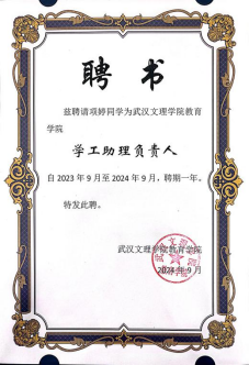 社会实践方面,曾作为本校第一批学生代表参加湖北省第十届小学教育专业技能竞赛,并获省级荣誉。所在团队曾获湖北省第十四届大学生“挑战杯”省级三等奖。2023年在“三下乡”活动中获“优秀志愿者”称号,所在团队获省级优秀团队荣誉,累计志愿服务时长360余小时。