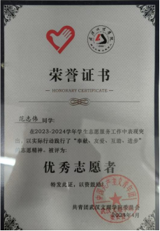 在校期间,积极投身于各类志愿活动,累计服务时长达800余小时,用实际行动诠释奉献精神。2022年学校封校期间参与扫码服务50余次、教师资格证志愿服务、高等教育自学考试志愿服务、2023年上学期爱尔眼科举办的高校联谊志愿者活动、2023年3月5日雷锋志愿活动日献血活动、学院组织的学风纠察志愿活动、 两次师生同乐会活动、江北高校志愿者联盟交流会、养老院志愿活动、自闭症儿童志愿活动、地铁站志愿活动、2023年暑假三下乡社会暑期实践活动(武穴市大法寺镇翟畈中心小学支教)、2024年作为部门代表,组织人员帮助银湖社区建设美好社区打造三面消防墙绘、武汉空港国际商务新城半程马拉松志愿服务活动、“中国航天日”志愿服务活动。
