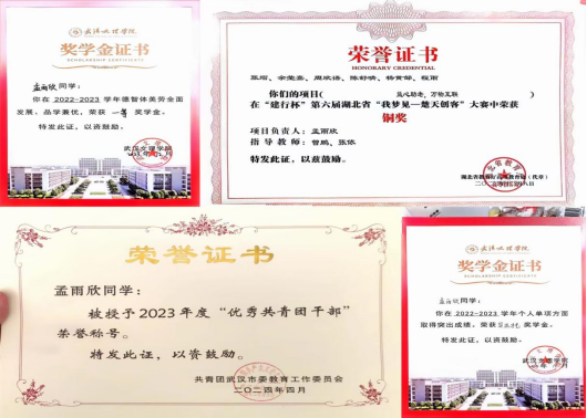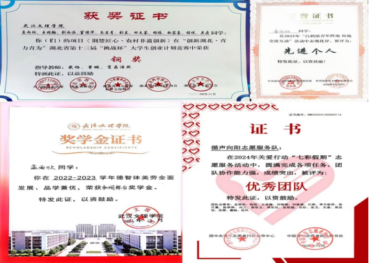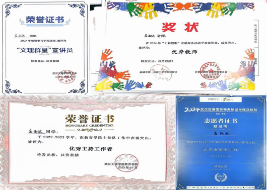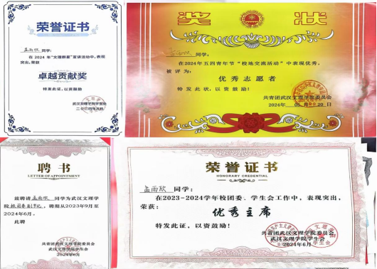 曾任校团委副书记、校广播台台长,负责青春武汉文理公众号、团团文理视频号等多平台,发文累计超716余篇,负责部门及广播台连续三年获优秀部门、优秀团队,现任21小教5班团支书、班长,综测成绩连续四年班级第一,获和润综合奖学金(全校仅5人),多次获市、校级优秀干部称号,在校期间,共获国家级、校级、院级荣誉40余项。主持永利集团二十周年校庆庆典,作为唯一一名学生代表在校级教师节表彰大会发言。朗诵《雾重庆》入围CCTV朗诵比赛,广告作品获学院奖、入选国际展览、中国青年学生国防教育数字创意比赛湖北省三等奖。带领循声向阳志愿服务队参与2024暑期社会实践,获省级优秀团队,获校级优秀团队、优秀先进个人,带队参加房县青春阵地朗诵和五四文理群星先导片录制,作为第一批青马骨干班班班长,带领大家在理论与实践中学习体验,以97.2分成绩结业获优秀学员。投身支教和应急科普,参与全国APP公益实习,获全国优秀实习生,组织江岸区红领巾小小应急宣传员项目,为武汉市超20个社区,共计2000余人次服务,受邀成为江岸区首批安全宣推官,并将志愿服务经历凝聚为科技成果,获互联网+、挑战杯省级铜奖,个人经历受到人民网、学习强国多个平台报道。