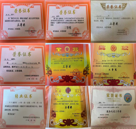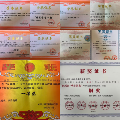 2022-2023获得一等奖学金、优秀学生干部标兵、突出才艺奖、创新创业奖、精神文明奖