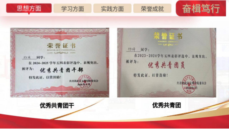 担任班级团支书期间,她不仅积极参与党校、团校培训,锤炼自身党性修养,还将思想的星火传递给身边同学,牵头组织十余场主题团日活动。凭借突出的工作表现,她先后荣获“优秀共青团干部”“优秀共青团员”等荣誉称号。