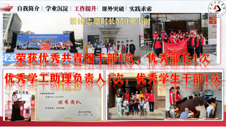 在任职团支书期间,组织团日活动12场、学习互助小组活动8次,凝聚了班级力量,个人获评“优秀共青团干部”;任职校团委办公室部长时,统筹协调资源,牵头组织健康文体月、校运动会、文理群星晚会等17场大型文体活动,创新团校运动会模式,工作成效获校团委认可,获评“优秀部长”;同时她还担任学工助理负责人,协助学工处开展学生日常管理、活动统筹等工作。作为早锻炼助教团队核心成员,她参与制定助教工作方案、组织日常训练指导,助力团队荣获2022—2023学年“优秀团队——早锻炼小助教”。