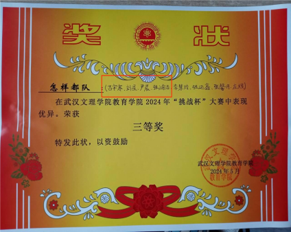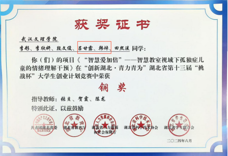 创新实践突破:5名同学投身“挑战杯”“互联网+”等竞赛,斩获院级以上奖项10项。其中,吕甘露与韩焯团队的项目《“智慧爱加倍”——智慧教室视域下孤独症儿童情绪理解干预》荣获省级铜奖。备赛期间,团队13易其稿,反复打磨路演细节,展现了未来教师精益求精的专业追求与创新精神。