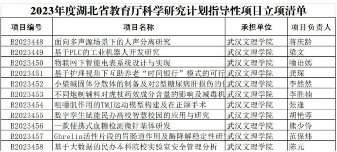 根据省教育厅下发的2024年度湖北省教育厅立项清单,yl9193永利集团副院长贺霞申报的《湖北省民办高校大学生心理素质测评体系研究》获批高校优秀中青年科技创新团队,信息与计算机学院老师蒋庆龄申报的《面向多声源场景下的人声分离研究》、喻语嫣申报的《物联网下智能电表系统设计与实现》、胡艳蓉申报的《数字孪生赋能民办高校智慧校园的应用与研究》,智能制造与无损检测学院老师梁文申报的《基于PLC的工业机器人开发研究》、张逢申报的《咀嚼肌作用的TMJ运动模型构建及在正颌手术》,医学院老师龚琛申报的《基于护理视角下互助养老“时间银行”模式的可行性研究》、李然然申报的《小檗碱固体分散体的制备及对2型糖尿病肝损伤的保护作用研究》、李胜楠申报的《不同炮制辅料对虎杖药效成分含量的影响及减毒机制研究》、熊少伶申报的《一款便携式血糖检测微针基体研发》、范保炜申报的《Ghrelin活性片段的胃肠道作用及酶降解稳定性研究》,教务处老师陈元申报的《基于大数据的民办本科院校实验室安全管理分析》获批指导性项目。