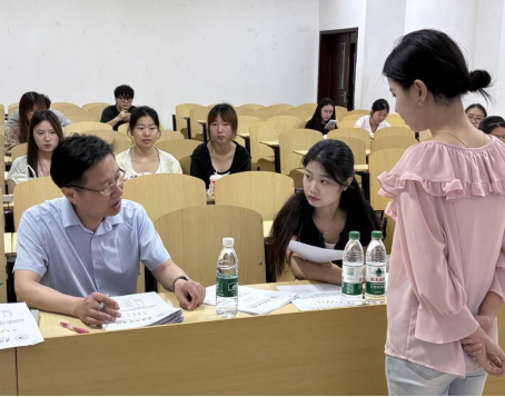 答辩过程中,学生们认真陈述,评委们耐心倾听、精准提问,现场气氛庄重而热烈。五个答辩小组分别于指定教室同步开展,教师与学生之间交流充分,问题引导深入,体现出良好的教学相长局面。部分教师还结合自己科研经验,鼓励学生从实际教学出发,开展有温度、有深度的实践研究,提升研究的现实意义与价值。